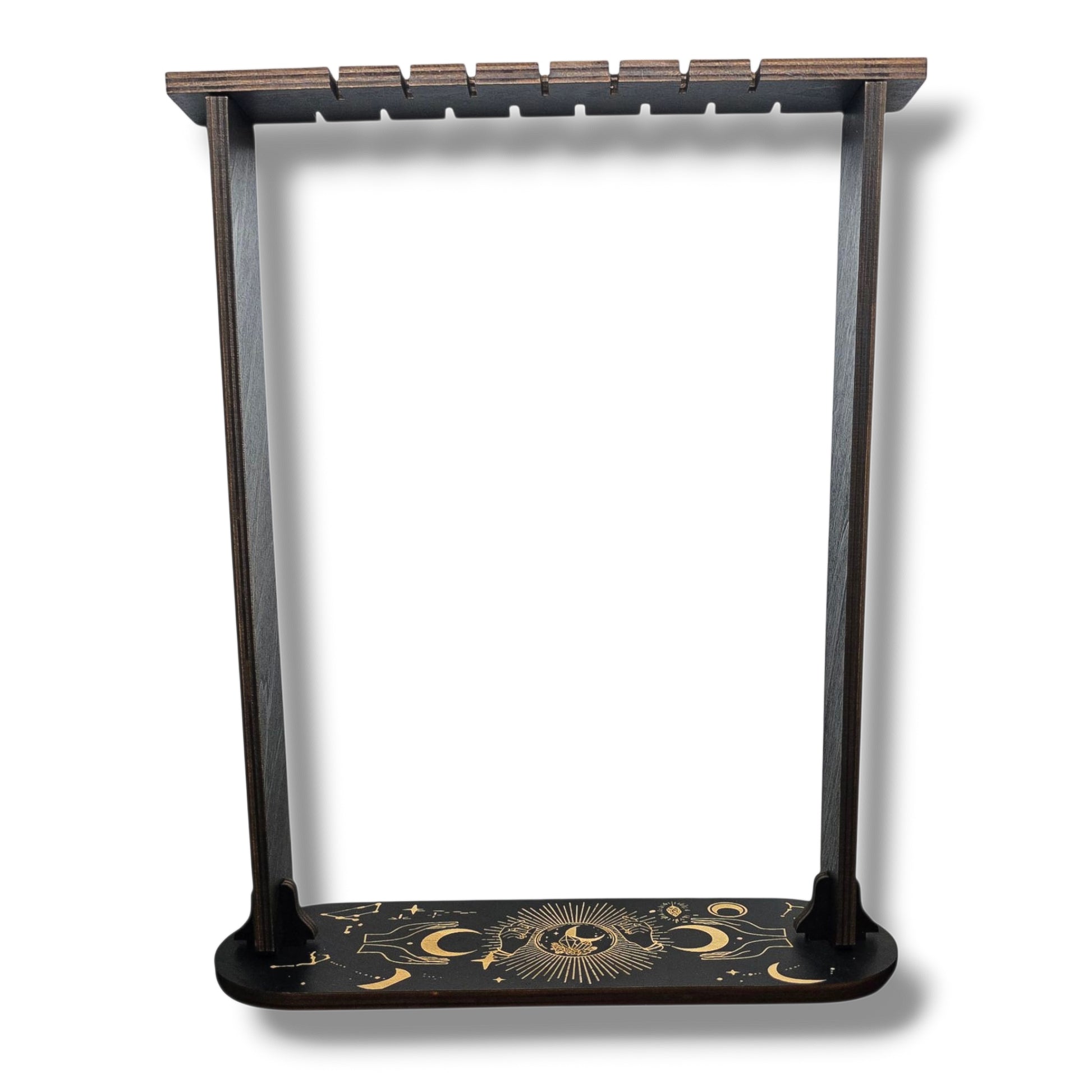 Ce superbe support à pendule, orné d’un motif mystique associant cristaux et croissant de lune, est idéal pour exposer vos pendules avec élégance tout en les gardant soigneusement organisés. Il dispose de 15 encoches pour suspendre vos pendules de manière ordonnée et accessible, ajoutant une touche spirituelle raffinée à votre autel, votre bureau ou votre coin ésotérique.